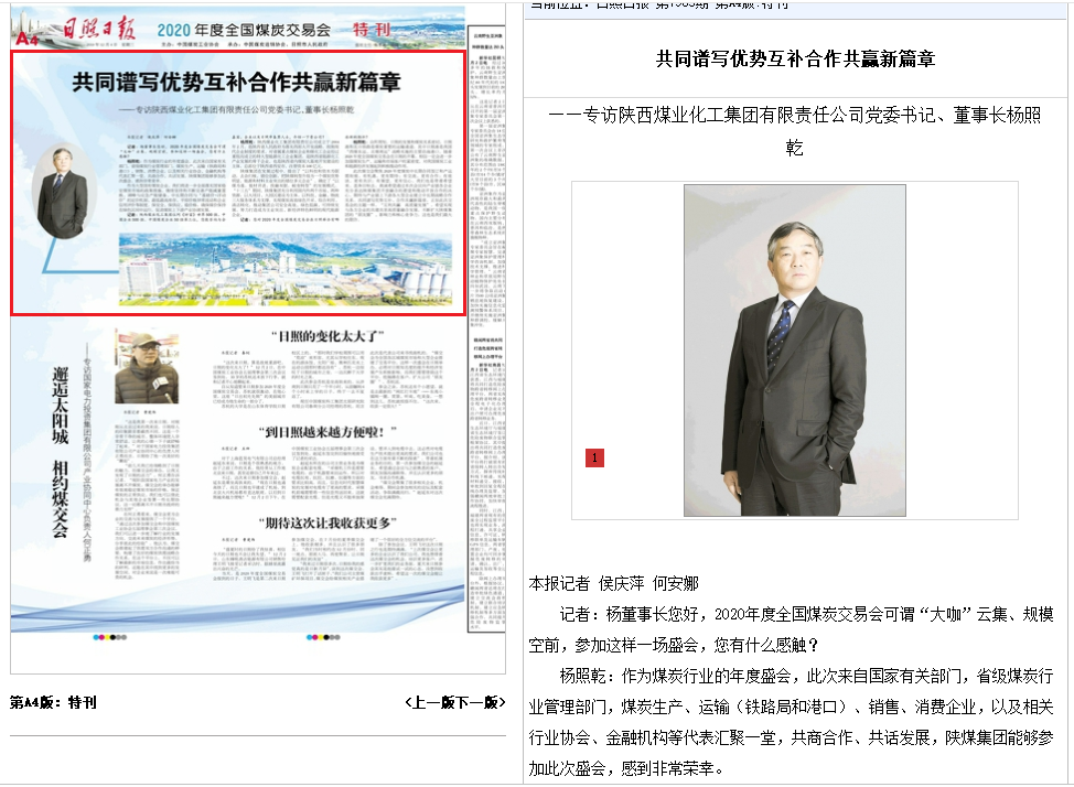 編者按:2020年度全國煤炭交易會12月4日至6日在山東日照召開,12月4日會議開幕當天,日照日報發表了采訪集團公司黨委書記、董事長楊照乾的文章——《共同譜寫優勢互補合作共贏新篇章——專訪陜西煤業化工集團有限責任公司黨委書記、董事長楊照乾》。